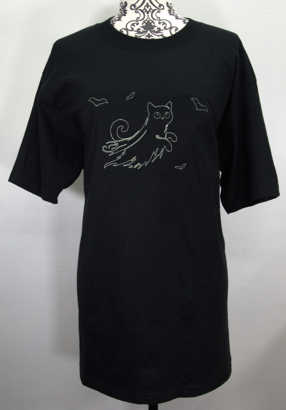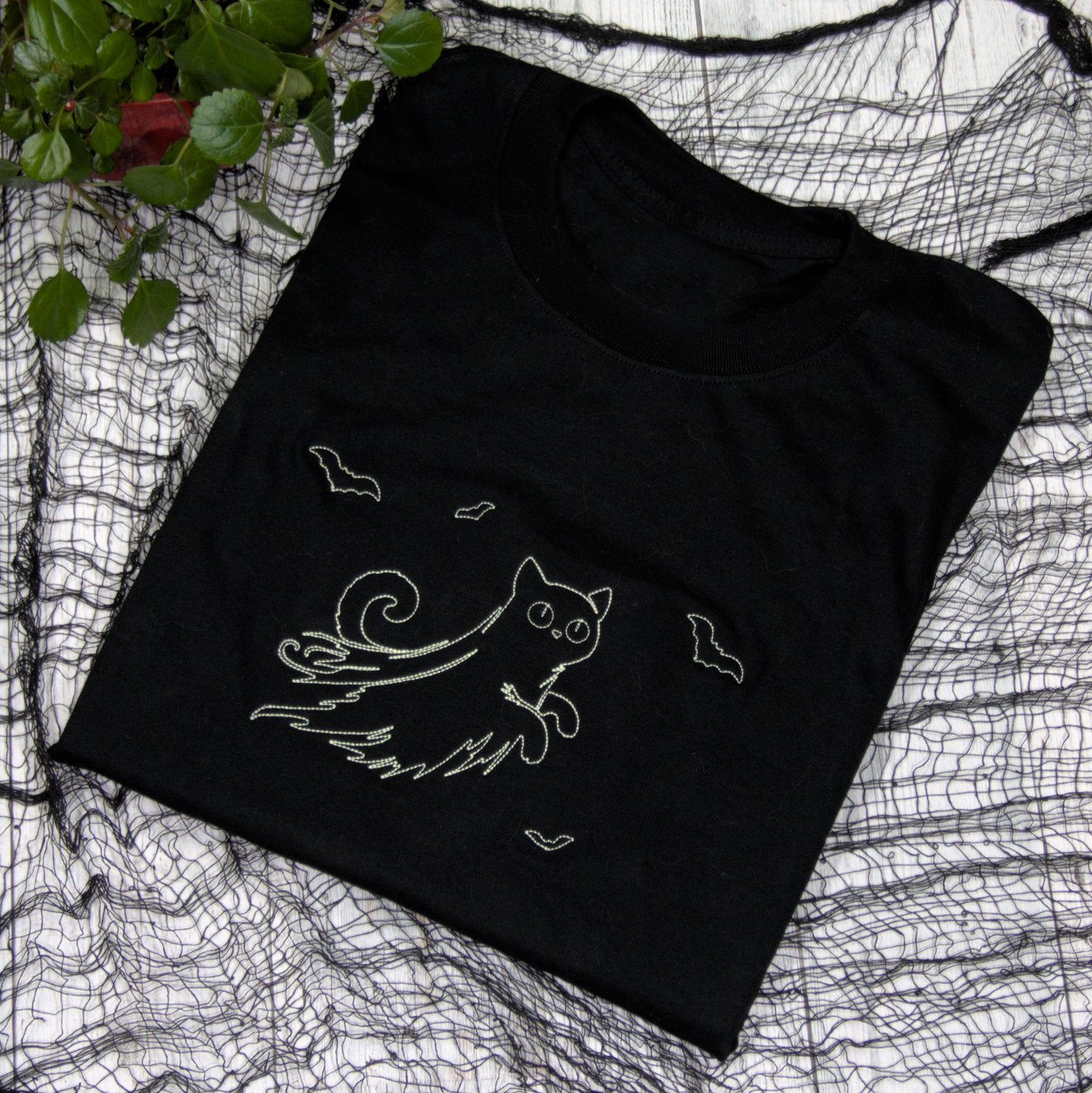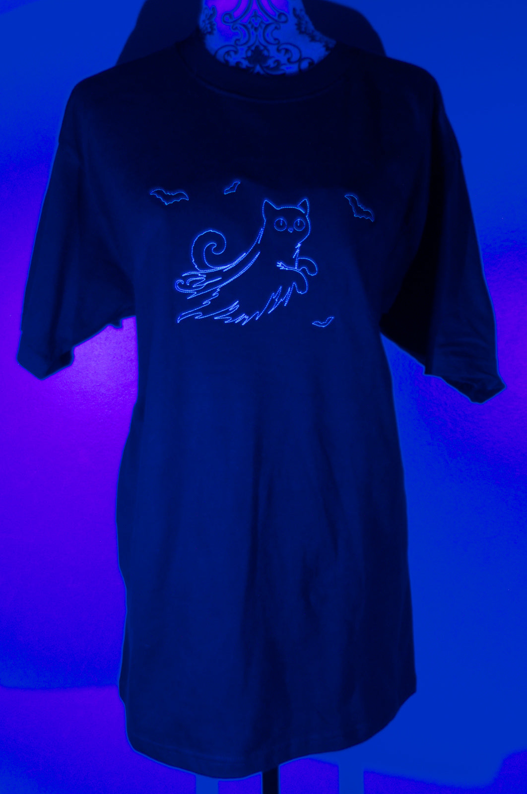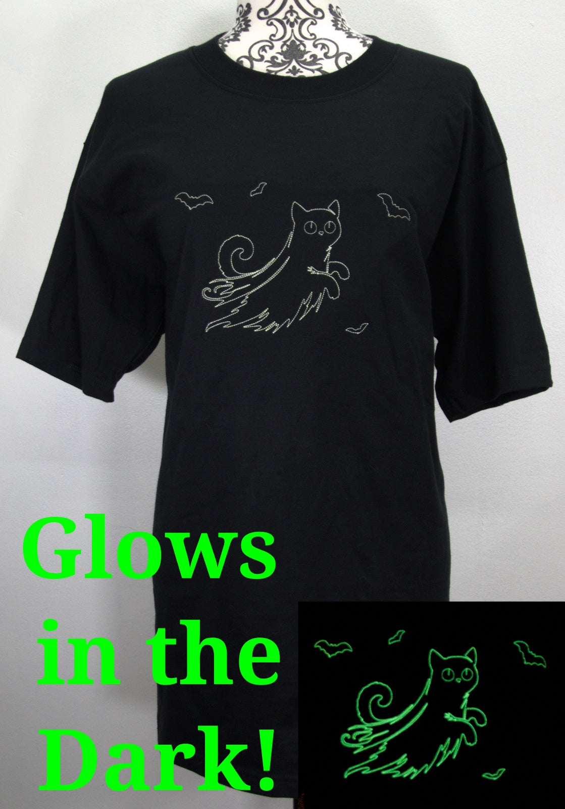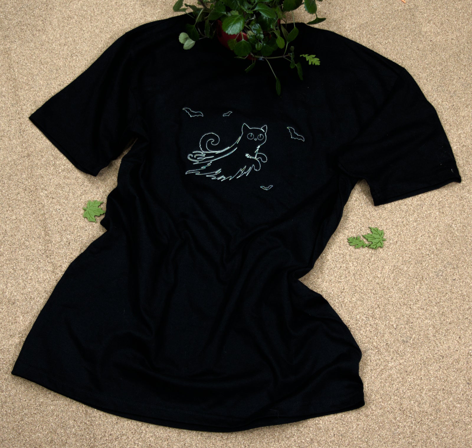 By day, Cat-sper’s delicate embroidery rests quietly on deep black fabric. But once the lights dim, his outline shimmers to life in an enchanting green glow — a friendly feline spirit keeping watch through the night.
