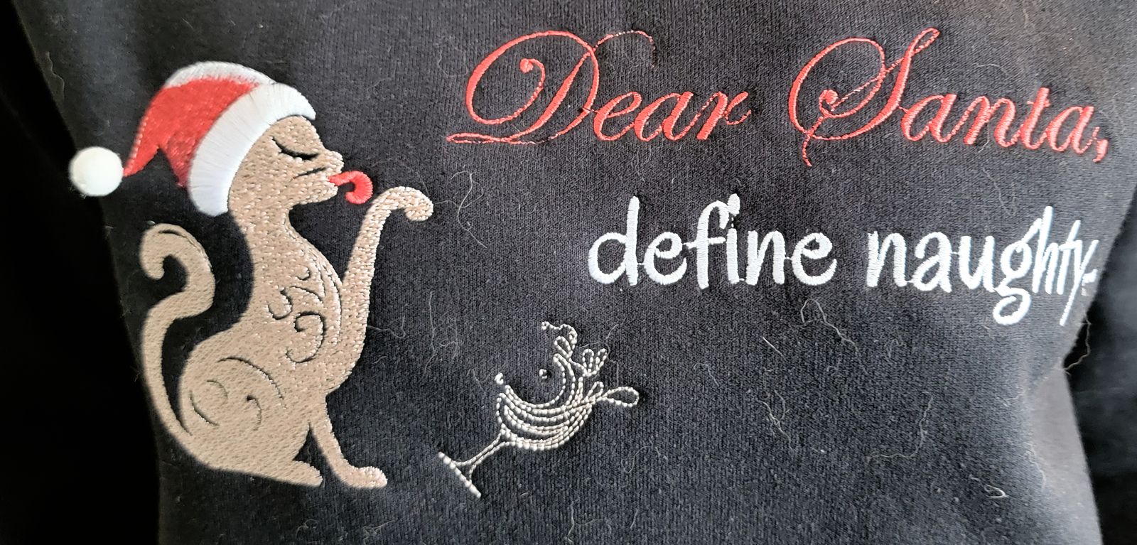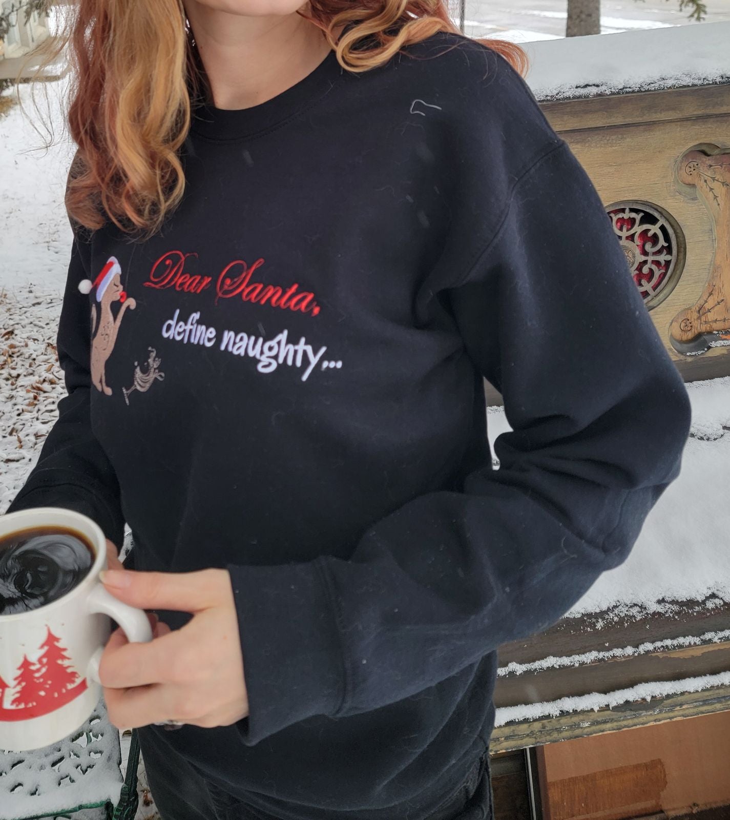 Beside her, bold red stitching spells “Dear Santa,” followed underneath by crisp white lettering: “Define naughty…”
