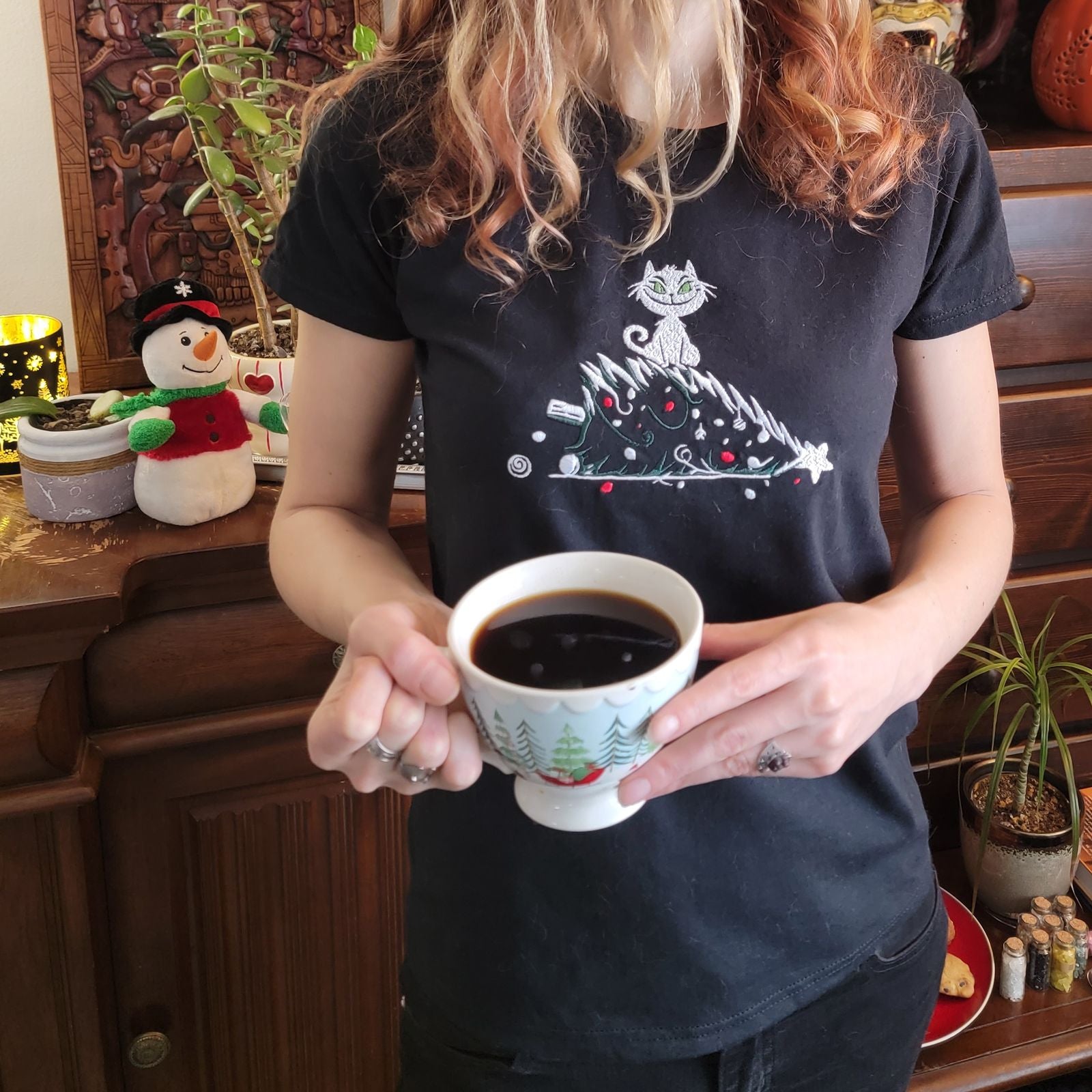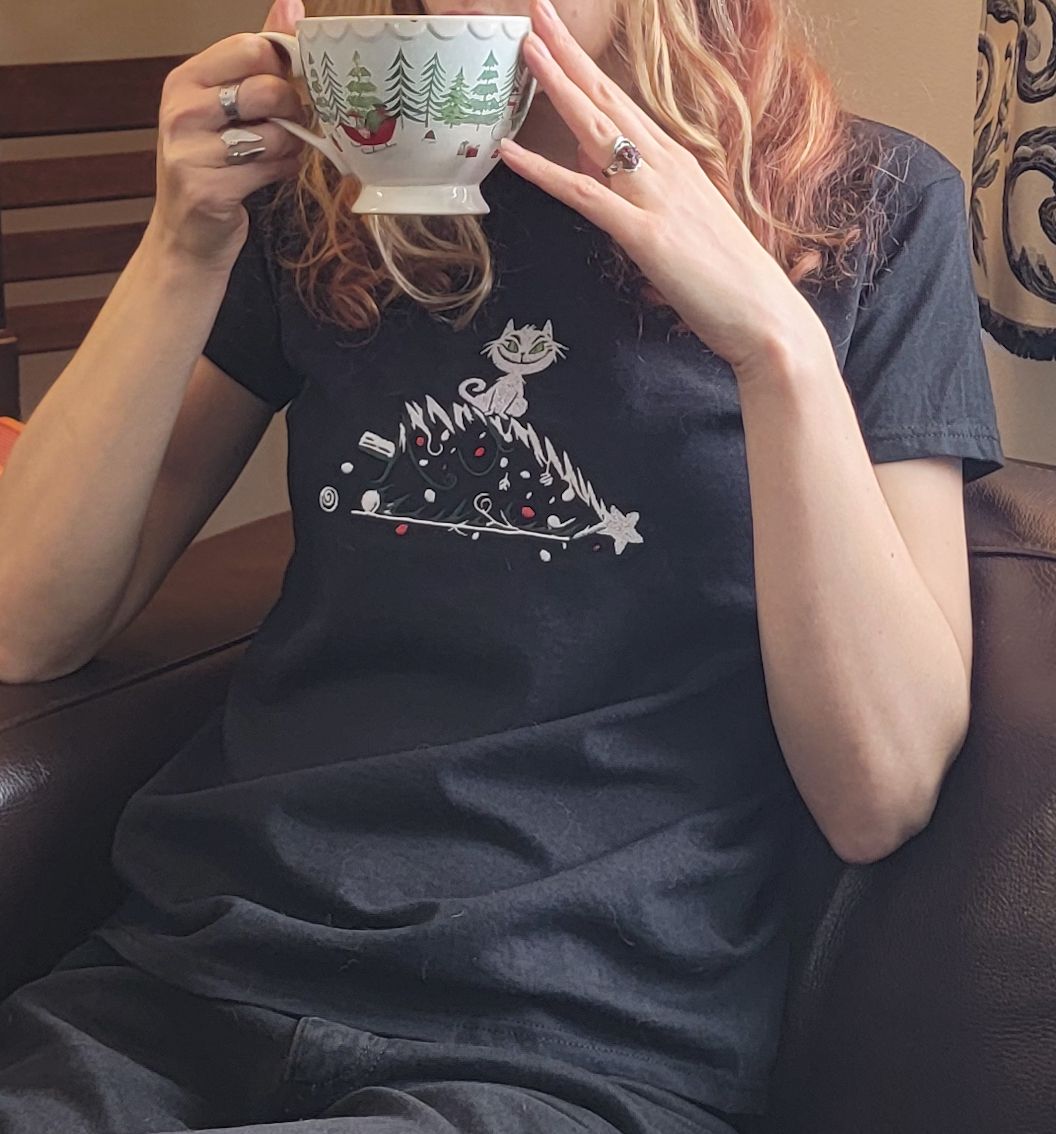 Meet holiday mischief in its most adorable form with the Grinchkitty tee — a soft black t-shirt embroidered with a devilishly grinning white cat perched triumphantly atop a toppled Christmas tree. Her bright green eyes gleam with unmistakable intent, narrow pupils giving her that charmingly guilty “I regret nothing” look.