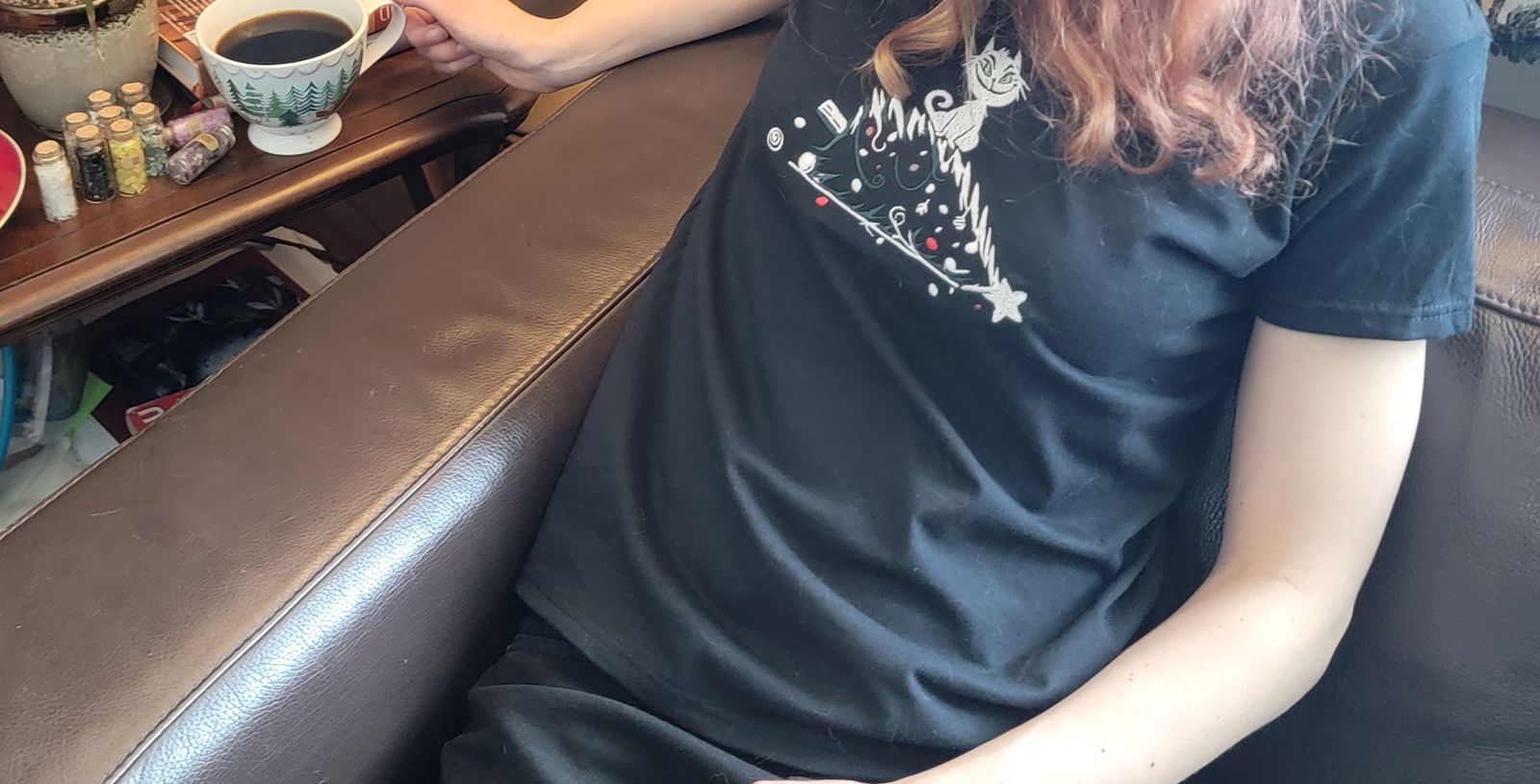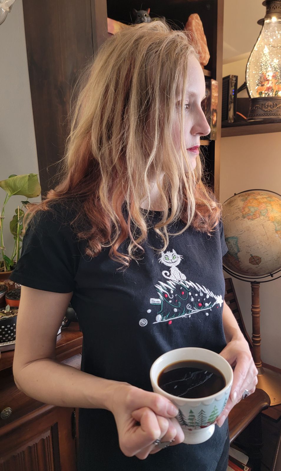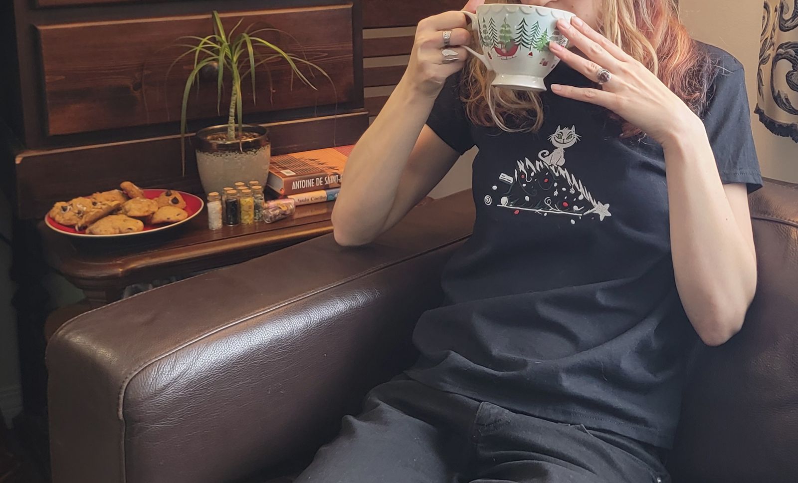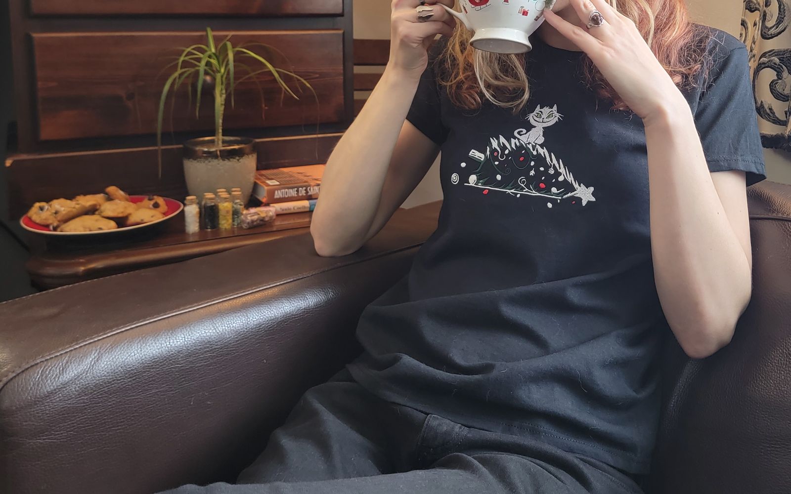 The tree spills across the fabric in delicate white outlines with playful green highlights, while scattered red and white ornaments rest around her like the remnants of a festive battle. It’s a scene every cat lover knows well — a little chaos, a little charm, and a whole lot of personality.