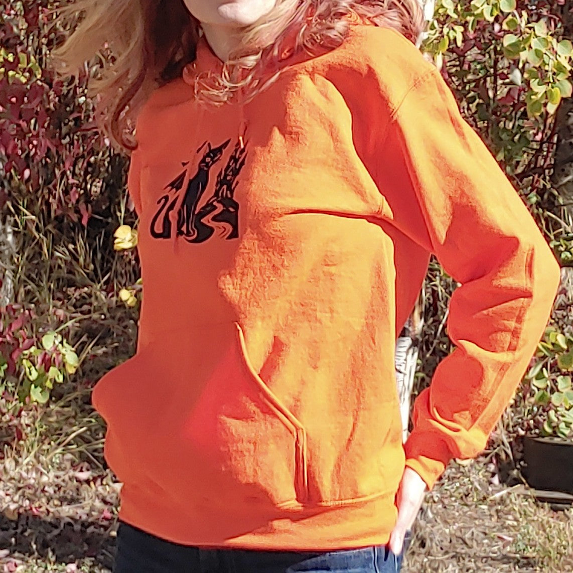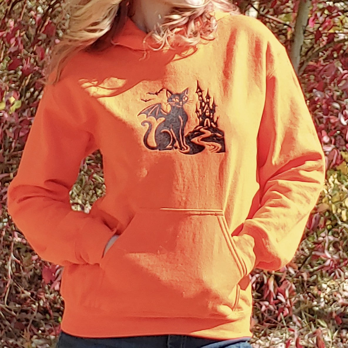 Step into autumnal enchantment with a vivid orange hoodie featuring a black cat with delicate bat-like wings, perched before a distant, shadowy castle. Subtle embroidery hints at mystery, while the soft cotton blend ensures cozy warmth.