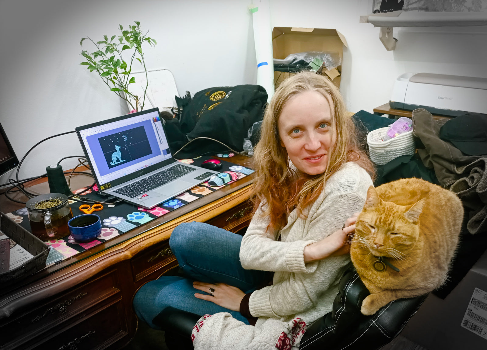 We’re a small family of two humans and three very opinionated cats, working from our cozy home studio in Red Deer, Alberta. Our feline coworkers supervise every project (usually from the most inconvenient spot possible) while we pour our love for cats into every design we make.