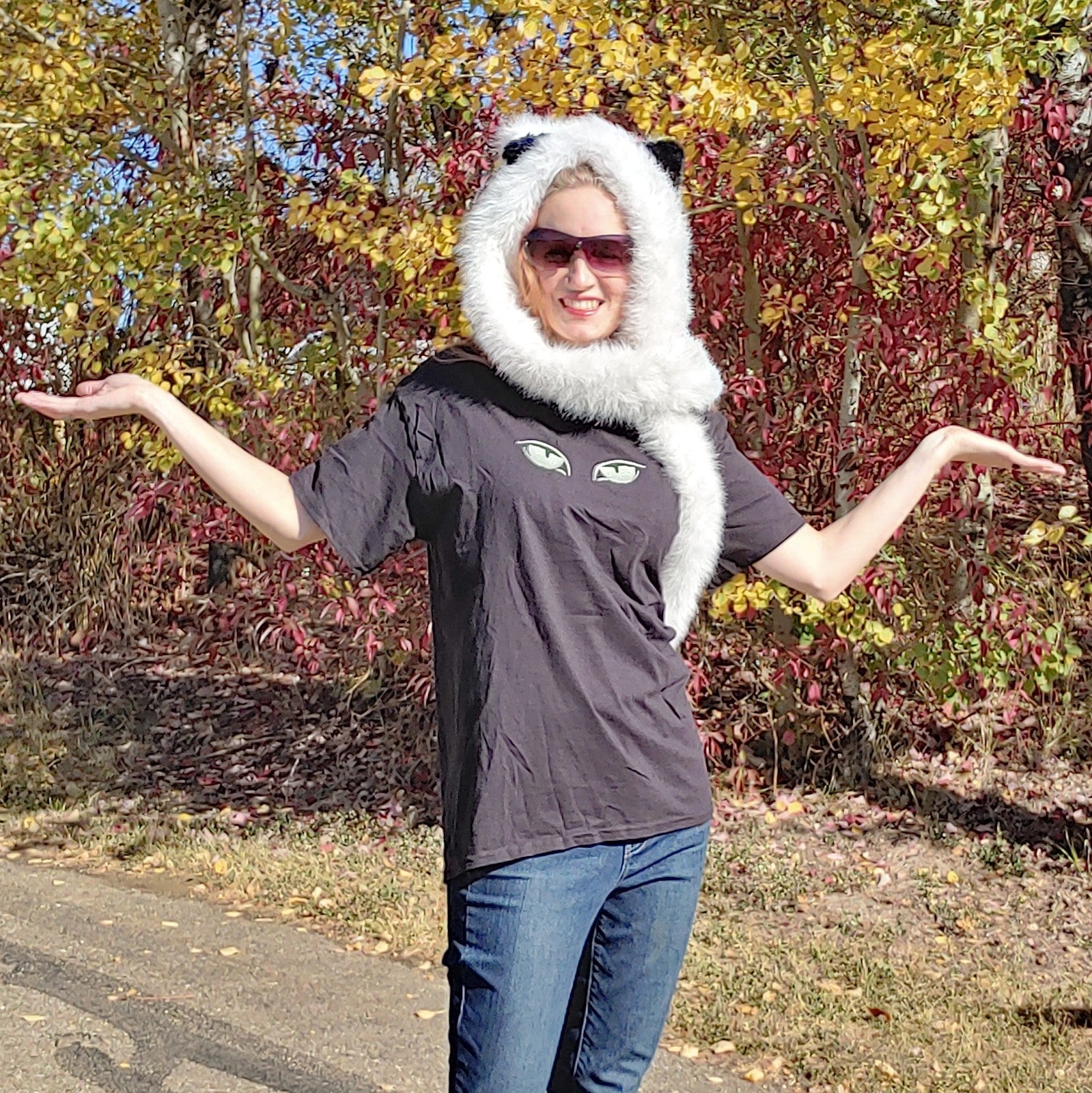 By day, bold feline eyes rest subtly on black fabric. When night falls, the glow-in-the-dark embroidery animates the gaze, following you with an almost sentient presence. Perfect for moonlit walks, late-night stories, or cozy nights at home.
